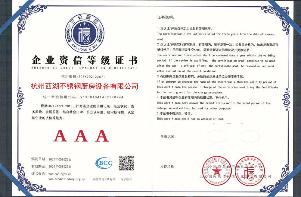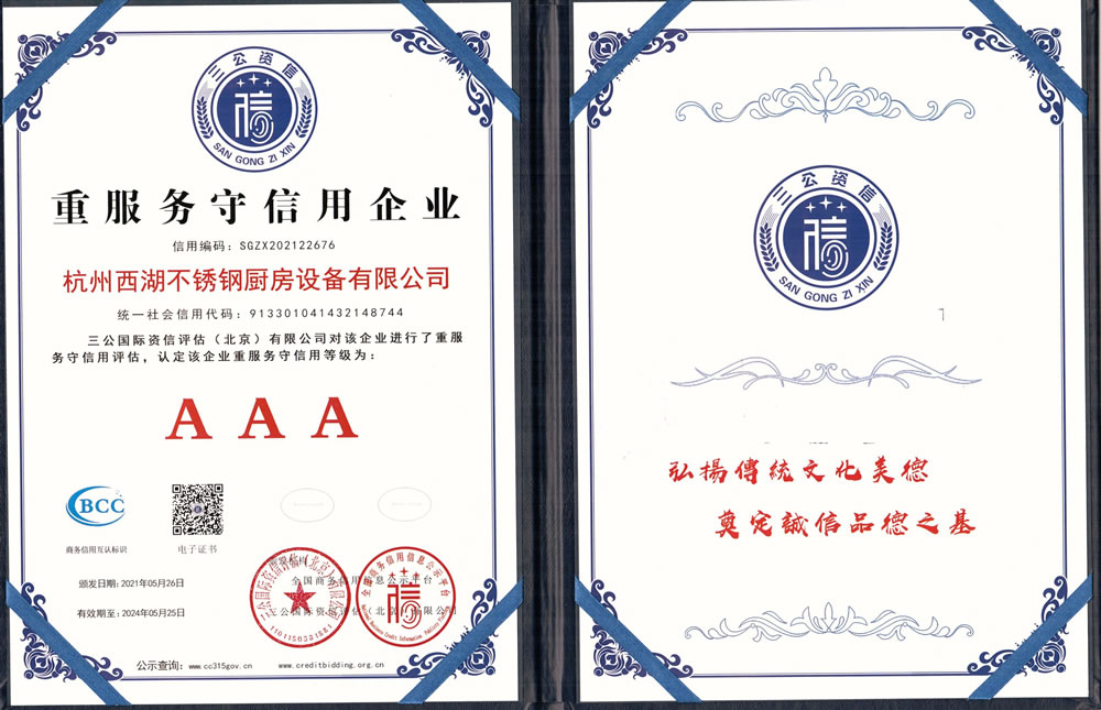 杭州西湖不銹鋼廚房設備有限公司成立20年以來,通過一系列創造性的工作,凝聚企業力量,發揮自身優勢,助推企業發展和品牌建設,取得了一些榮譽,這是廣大西湖廚房設備員工共同努力和各位新老客戶共同支持的結果,我們將再接再厲創造更多的輝煌!